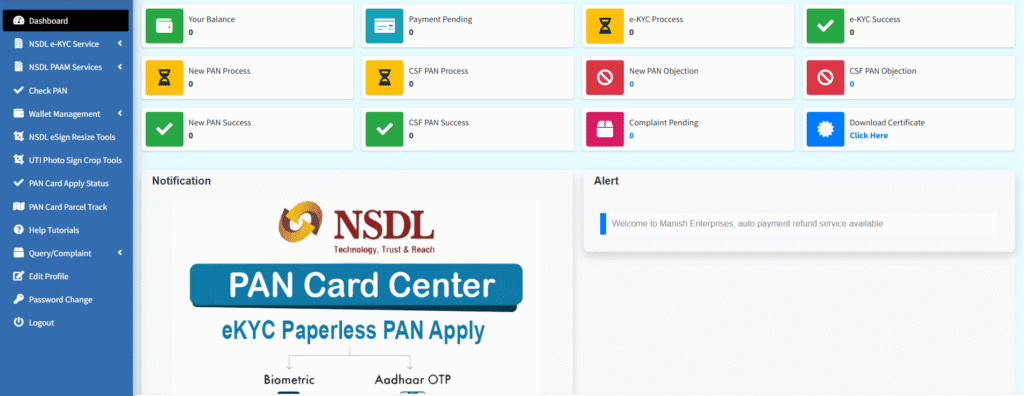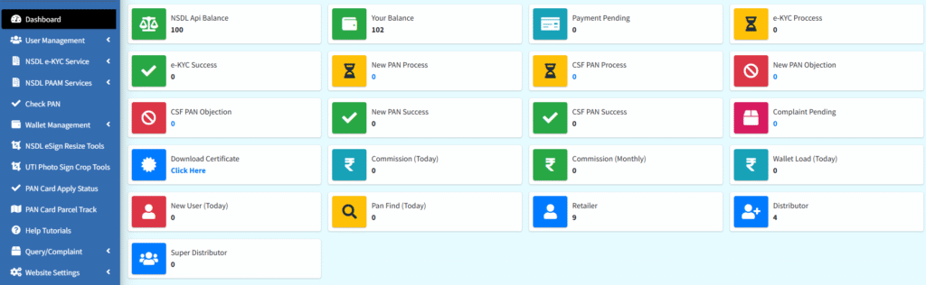 In this Retailer dashboard all the application made by retailer will be shown. Its wallet balance and if any objection in pancard. User can add balance using wallet Management option. Retailer can check the pan status from here it self api are integrated in this portal. If any query then they can raise query and admin will take action on that query.